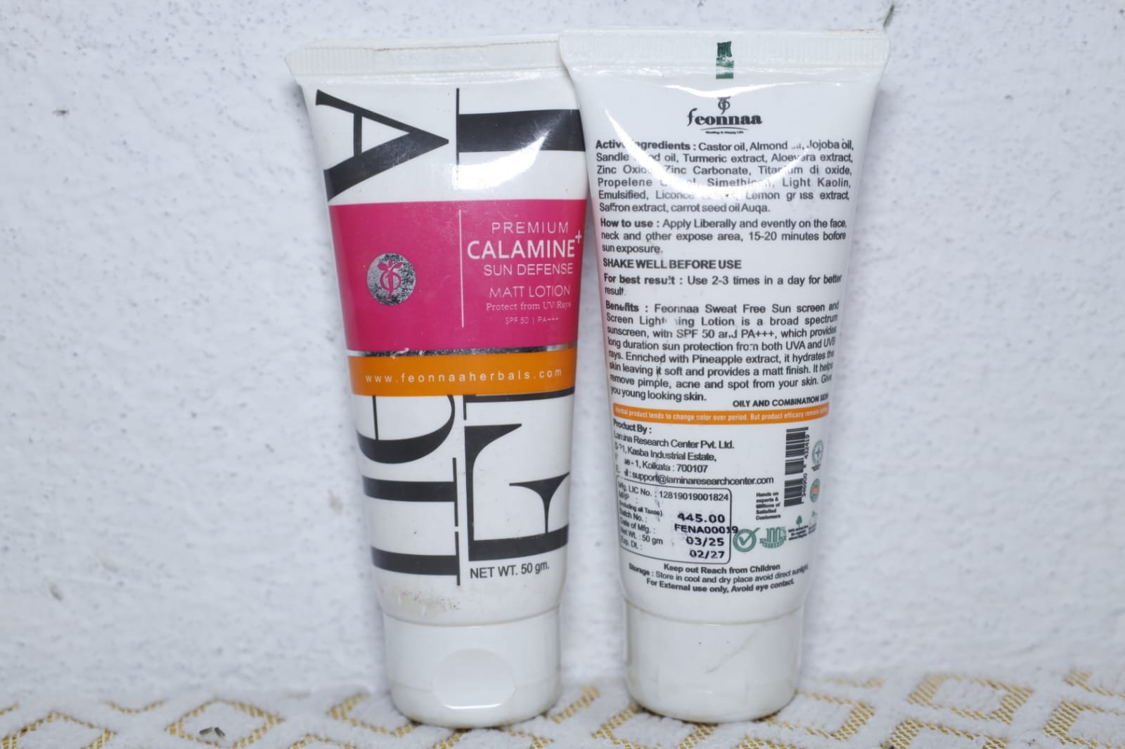“Calamine Sun Defence Matt Lotion: Ayurvedic blend with Calamine, Aloe Vera, and Turmeric. Protects skin from UV rays, soothes sunburn, reduces redness, and controls oil for a matte finish. Perfect for daily sun protection 🌿.”