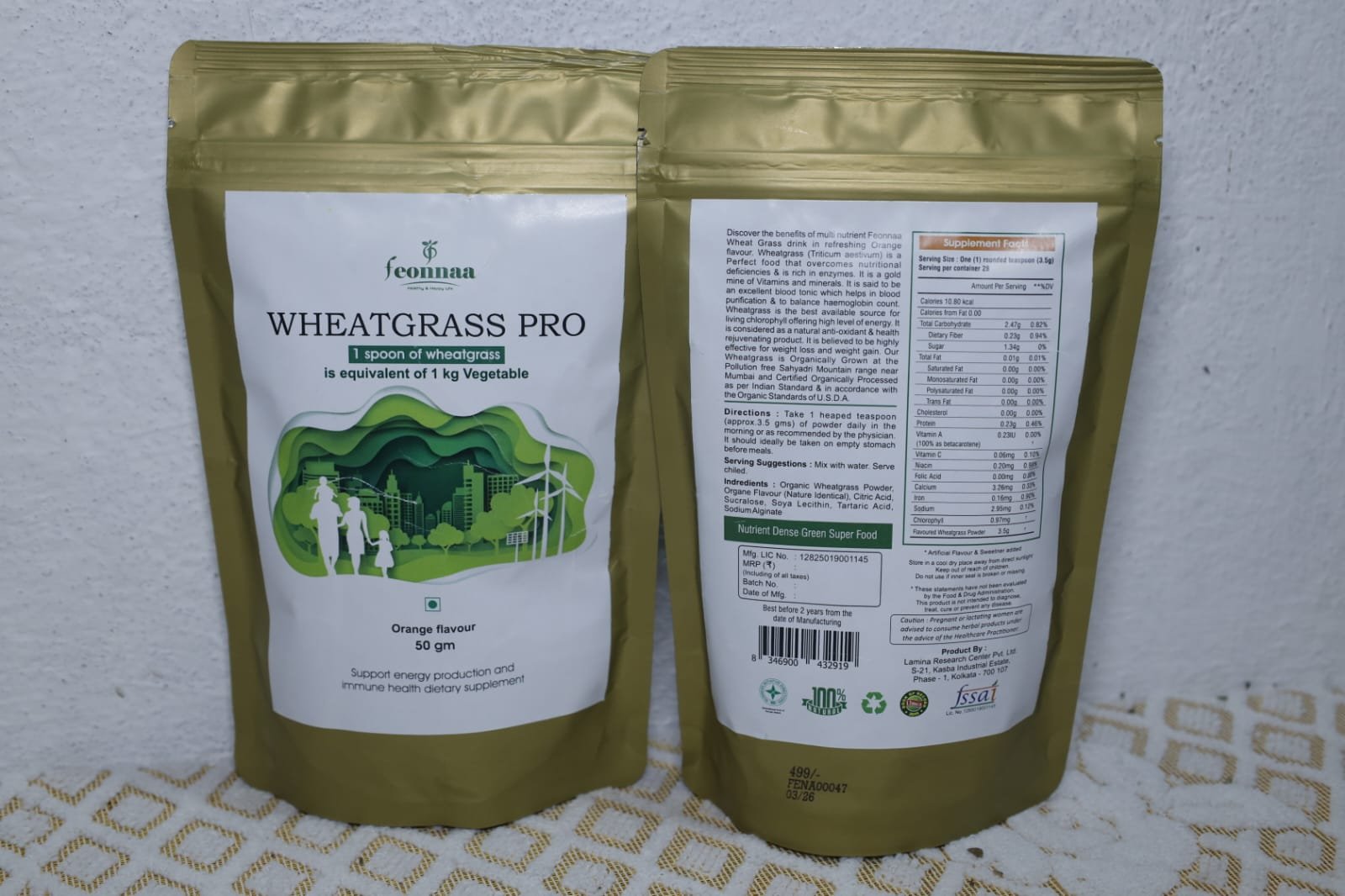 “Wheatgrass Pro: Packed with 1kg of vegetable power in every serving! This Ayurvedic supplement is a nutrient-dense blend of wheatgrass, moringa, and spirulina. Rich in antioxidants, vitamins, and minerals, it detoxifies, boosts immunity, and promotes overall well-being 🌿.